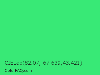 CIELab 82.07,-67.639,43.421 Color is a normal green color and the nearest color is UFO Green #3cd070. Hex code #38e976 and RGB value is rgb(56,233,118). In RGB color space, this color is composed of 22% red, 91% green, 46% blue, In CMYK color space, this color is composed of 76% cyan, 0% magenta, 49% yellow , 9% black , In HSL color space, this color has a hue angle of 141° , 80% saturation and 57% lightness.