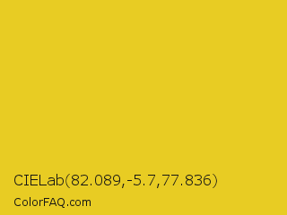 CIELab 82.089,-5.7,77.836 Color is a normal yellow color and the nearest color is Sunflower #e4d422. Hex code #e8cc23 and RGB value is rgb(232,204,35). In RGB color space, this color is composed of 91% red, 80% green, 14% blue, In CMYK color space, this color is composed of 0% cyan, 12% magenta, 85% yellow , 9% black , In HSL color space, this color has a hue angle of 51° , 81% saturation and 52% lightness.