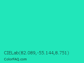 CIELab 82.089,-55.144,8.751 Color is a normal cyan color and the nearest color is Turquoise PWG #30d5c8. Hex code #21e6ba and RGB value is rgb(33,230,186). In RGB color space, this color is composed of 13% red, 90% green, 73% blue, In CMYK color space, this color is composed of 86% cyan, 0% magenta, 19% yellow , 10% black , In HSL color space, this color has a hue angle of 167° , 80% saturation and 52% lightness.