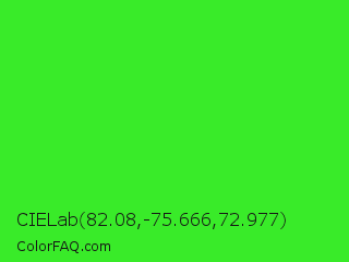 CIELab 82.08,-75.666,72.977 Color is a normal green color and the nearest color is Neon Green #39ff14. Hex code #39eb29 and RGB value is rgb(57,235,41). In RGB color space, this color is composed of 22% red, 92% green, 16% blue, In CMYK color space, this color is composed of 76% cyan, 0% magenta, 83% yellow , 8% black , In HSL color space, this color has a hue angle of 115° , 83% saturation and 54% lightness.