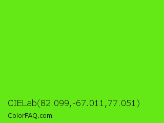 CIELab 82.099,-67.011,77.051 Color is a normal green color and the nearest color is Bright Green #66ff00. Hex code #64e816 and RGB value is rgb(100,232,22). In RGB color space, this color is composed of 39% red, 91% green, 9% blue, In CMYK color space, this color is composed of 57% cyan, 0% magenta, 91% yellow , 9% black , In HSL color space, this color has a hue angle of 98° , 83% saturation and 50% lightness.