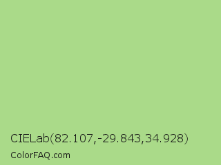 CIELab 82.107,-29.843,34.928 Color is a light green color and the nearest color is Feijoa #9fdd8c. Hex code #aada89 and RGB value is rgb(170,218,137). In RGB color space, this color is composed of 67% red, 85% green, 54% blue, In CMYK color space, this color is composed of 22% cyan, 0% magenta, 37% yellow , 15% black , In HSL color space, this color has a hue angle of 96° , 52% saturation and 70% lightness.
