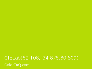 CIELab 82.108,-34.878,80.509 Color is a normal lime color and the nearest color is Fuego #bede0d. Hex code #b5db05 and RGB value is rgb(181,219,5). In RGB color space, this color is composed of 71% red, 86% green, 2% blue, In CMYK color space, this color is composed of 17% cyan, 0% magenta, 98% yellow , 14% black , In HSL color space, this color has a hue angle of 71° , 96% saturation and 44% lightness.