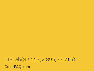 CIELab 82.113,2.895,73.715 Color is a normal yellow color and the nearest color is Saffron #f4c430. Hex code #f5c734 and RGB value is rgb(245,199,52). In RGB color space, this color is composed of 96% red, 78% green, 20% blue, In CMYK color space, this color is composed of 0% cyan, 19% magenta, 79% yellow , 4% black , In HSL color space, this color has a hue angle of 46° , 91% saturation and 58% lightness.