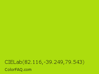 CIELab 82.116,-39.249,79.543 Color is a normal lime color and the nearest color is Inch Worm #b0e313. Hex code #acdd0d and RGB value is rgb(172,221,13). In RGB color space, this color is composed of 67% red, 87% green, 5% blue, In CMYK color space, this color is composed of 22% cyan, 0% magenta, 94% yellow , 13% black , In HSL color space, this color has a hue angle of 74° , 89% saturation and 46% lightness.