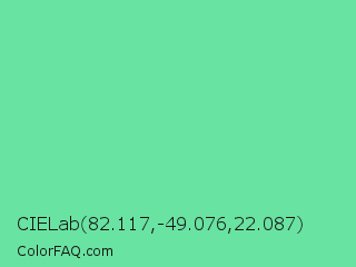 CIELab 82.117,-49.076,22.087 Color is a light green color and the nearest color is Medium Aquamarine #66ddaa. Hex code #69e3a1 and RGB value is rgb(105,227,161). In RGB color space, this color is composed of 41% red, 89% green, 63% blue, In CMYK color space, this color is composed of 54% cyan, 0% magenta, 29% yellow , 11% black , In HSL color space, this color has a hue angle of 148° , 69% saturation and 65% lightness.