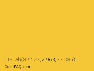 CIELab 82.123,2.963,73.085 Color is a normal yellow color and the nearest color is Saffron #f4c430. Hex code #f5c736 and RGB value is rgb(245,199,54). In RGB color space, this color is composed of 96% red, 78% green, 21% blue, In CMYK color space, this color is composed of 0% cyan, 19% magenta, 78% yellow , 4% black , In HSL color space, this color has a hue angle of 46° , 91% saturation and 59% lightness.