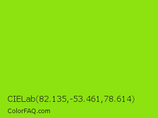 CIELab 82.135,-53.461,78.614 Color is a normal green color and the nearest color is Alien Armpit #84de02. Hex code #8ce30f and RGB value is rgb(140,227,15). In RGB color space, this color is composed of 55% red, 89% green, 6% blue, In CMYK color space, this color is composed of 38% cyan, 0% magenta, 93% yellow , 11% black , In HSL color space, this color has a hue angle of 85° , 88% saturation and 47% lightness.