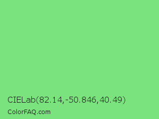CIELab 82.14,-50.846,40.49 Color is a light green color and the nearest color is Pastel Green #77dd77. Hex code #7ae37d and RGB value is rgb(122,227,125). In RGB color space, this color is composed of 48% red, 89% green, 49% blue, In CMYK color space, this color is composed of 46% cyan, 0% magenta, 45% yellow , 11% black , In HSL color space, this color has a hue angle of 122° , 65% saturation and 68% lightness.