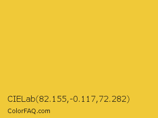 CIELab 82.155,-0.117,72.282 Color is a normal yellow color and the nearest color is Saffron #f4c430. Hex code #f0c938 and RGB value is rgb(240,201,56). In RGB color space, this color is composed of 94% red, 79% green, 22% blue, In CMYK color space, this color is composed of 0% cyan, 16% magenta, 77% yellow , 6% black , In HSL color space, this color has a hue angle of 47° , 86% saturation and 58% lightness.