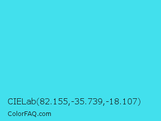CIELab 82.155,-35.739,-18.107 Color is a normal cyan color and the nearest color is Turquoise #40e0d0. Hex code #42e0ed and RGB value is rgb(66,224,237). In RGB color space, this color is composed of 26% red, 88% green, 93% blue, In CMYK color space, this color is composed of 72% cyan, 5% magenta, 0% yellow , 7% black , In HSL color space, this color has a hue angle of 185° , 83% saturation and 59% lightness.