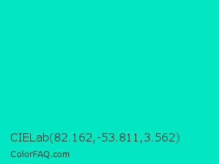 CIELab 82.162,-53.811,3.562 Color is a normal cyan color and the nearest color is Bright Turquoise #08e8de. Hex code #03e6c4 and RGB value is rgb(3,230,196). In RGB color space, this color is composed of 1% red, 90% green, 77% blue, In CMYK color space, this color is composed of 99% cyan, 0% magenta, 15% yellow , 10% black , In HSL color space, this color has a hue angle of 171° , 97% saturation and 46% lightness.