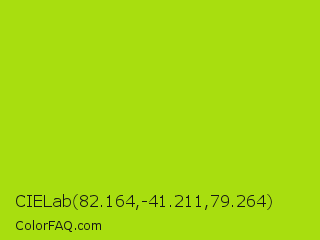 CIELab 82.164,-41.211,79.264 Color is a normal lime color and the nearest color is Inch Worm #b0e313. Hex code #a8de0f and RGB value is rgb(168,222,15). In RGB color space, this color is composed of 66% red, 87% green, 6% blue, In CMYK color space, this color is composed of 24% cyan, 0% magenta, 93% yellow , 13% black , In HSL color space, this color has a hue angle of 76° , 87% saturation and 46% lightness.