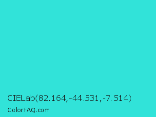 CIELab 82.164,-44.531,-7.514 Color is a normal cyan color and the nearest color is Turquoise #40e0d0. Hex code #31e3d9 and RGB value is rgb(49,227,217). In RGB color space, this color is composed of 19% red, 89% green, 85% blue, In CMYK color space, this color is composed of 78% cyan, 0% magenta, 4% yellow , 11% black , In HSL color space, this color has a hue angle of 177° , 76% saturation and 54% lightness.