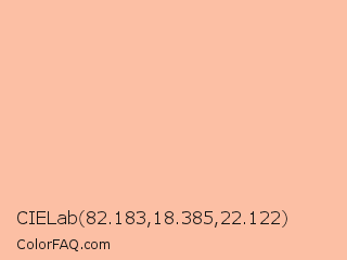 CIELab 82.183,18.385,22.122 Color is a very light orange color and the nearest color is Wax Flower #ffc0a8. Hex code #fcbfa4 and RGB value is rgb(252,191,164). In RGB color space, this color is composed of 99% red, 75% green, 64% blue, In CMYK color space, this color is composed of 0% cyan, 24% magenta, 35% yellow , 1% black , In HSL color space, this color has a hue angle of 18° , 94% saturation and 82% lightness.