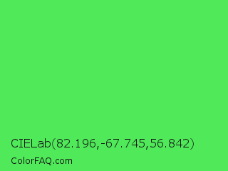 CIELab 82.196,-67.745,56.842 Color is a light green color and the nearest color is Screamin Green #66ff66. Hex code #4fe959 and RGB value is rgb(79,233,89). In RGB color space, this color is composed of 31% red, 91% green, 35% blue, In CMYK color space, this color is composed of 66% cyan, 0% magenta, 62% yellow , 9% black , In HSL color space, this color has a hue angle of 124° , 78% saturation and 61% lightness.