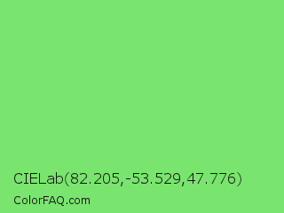 CIELab 82.205,-53.529,47.776 Color is a light green color and the nearest color is Pastel Green #77dd77. Hex code #79e46e and RGB value is rgb(121,228,110). In RGB color space, this color is composed of 47% red, 89% green, 43% blue, In CMYK color space, this color is composed of 47% cyan, 0% magenta, 52% yellow , 11% black , In HSL color space, this color has a hue angle of 114° , 69% saturation and 66% lightness.