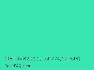 CIELab 82.211,-54.774,12.643 Color is a normal green color and the nearest color is Eucalyptus #44d7a8. Hex code #38e6b3 and RGB value is rgb(56,230,179). In RGB color space, this color is composed of 22% red, 90% green, 70% blue, In CMYK color space, this color is composed of 76% cyan, 0% magenta, 22% yellow , 10% black , In HSL color space, this color has a hue angle of 162° , 78% saturation and 56% lightness.