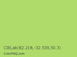 CIELab 82.218,-32.539,50.3 Color is a light green color and the nearest color is Inchworm #b2ec5d. Hex code #aedb6a and RGB value is rgb(174,219,106). In RGB color space, this color is composed of 68% red, 86% green, 42% blue, In CMYK color space, this color is composed of 21% cyan, 0% magenta, 52% yellow , 14% black , In HSL color space, this color has a hue angle of 84° , 61% saturation and 64% lightness.