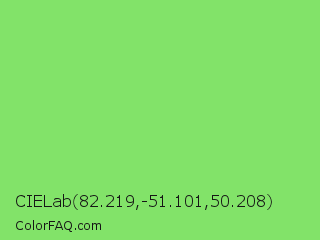 CIELab 82.219,-51.101,50.208 Color is a light green color and the nearest color is Pastel Green #77dd77. Hex code #82e369 and RGB value is rgb(130,227,105). In RGB color space, this color is composed of 51% red, 89% green, 41% blue, In CMYK color space, this color is composed of 43% cyan, 0% magenta, 54% yellow , 11% black , In HSL color space, this color has a hue angle of 108° , 69% saturation and 65% lightness.