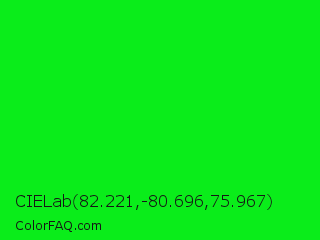 CIELab 82.221,-80.696,75.967 Color is a normal green color and the nearest color is Green #00ff00. Hex code #0aed1a and RGB value is rgb(10,237,26). In RGB color space, this color is composed of 4% red, 93% green, 10% blue, In CMYK color space, this color is composed of 96% cyan, 0% magenta, 89% yellow , 7% black , In HSL color space, this color has a hue angle of 124° , 92% saturation and 48% lightness.
