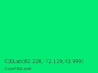 CIELab 82.228,-72.129,43.999 Color is a normal green color and the nearest color is Spring Green #00ff7f. Hex code #03eb75 and RGB value is rgb(3,235,117). In RGB color space, this color is composed of 1% red, 92% green, 46% blue, In CMYK color space, this color is composed of 99% cyan, 0% magenta, 50% yellow , 8% black , In HSL color space, this color has a hue angle of 149° , 97% saturation and 47% lightness.