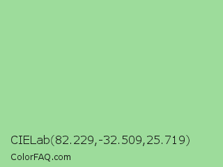 CIELab 82.229,-32.509,25.719 Color is a light green color and the nearest color is Granny Smith Apple Crayola #9de093. Hex code #9ddc9b and RGB value is rgb(157,220,155). In RGB color space, this color is composed of 62% red, 86% green, 61% blue, In CMYK color space, this color is composed of 29% cyan, 0% magenta, 30% yellow , 14% black , In HSL color space, this color has a hue angle of 118° , 48% saturation and 74% lightness.