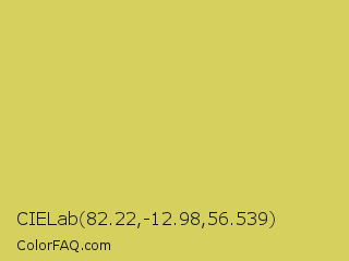 CIELab 82.22,-12.98,56.539 Color is a normal yellow color and the nearest color is Tacha #d6c562. Hex code #d6d15e and RGB value is rgb(214,209,94). In RGB color space, this color is composed of 84% red, 82% green, 37% blue, In CMYK color space, this color is composed of 0% cyan, 2% magenta, 56% yellow , 16% black , In HSL color space, this color has a hue angle of 58° , 59% saturation and 60% lightness.