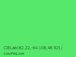 CIELab 82.22,-64.108,48.921 Color is a light green color and the nearest color is Screamin Green #66ff66. Hex code #55e86b and RGB value is rgb(85,232,107). In RGB color space, this color is composed of 33% red, 91% green, 42% blue, In CMYK color space, this color is composed of 63% cyan, 0% magenta, 54% yellow , 9% black , In HSL color space, this color has a hue angle of 129° , 76% saturation and 62% lightness.