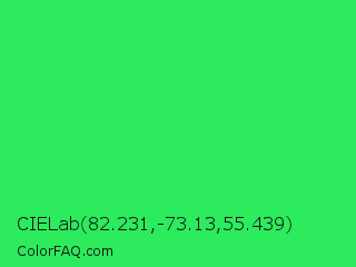 CIELab 82.231,-73.13,55.439 Color is a normal green color and the nearest color is UFO Green #3cd070. Hex code #2ceb5c and RGB value is rgb(44,235,92). In RGB color space, this color is composed of 17% red, 92% green, 36% blue, In CMYK color space, this color is composed of 81% cyan, 0% magenta, 61% yellow , 8% black , In HSL color space, this color has a hue angle of 135° , 83% saturation and 55% lightness.