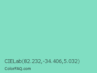 CIELab 82.232,-34.406,5.032 Color is a light green color and the nearest color is Bermuda #7dd8c6. Hex code #80dec2 and RGB value is rgb(128,222,194). In RGB color space, this color is composed of 50% red, 87% green, 76% blue, In CMYK color space, this color is composed of 42% cyan, 0% magenta, 13% yellow , 13% black , In HSL color space, this color has a hue angle of 162° , 59% saturation and 69% lightness.