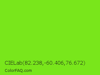 CIELab 82.238,-60.406,76.672 Color is a normal green color and the nearest color is Alien Armpit #84de02. Hex code #79e61b and RGB value is rgb(121,230,27). In RGB color space, this color is composed of 47% red, 90% green, 11% blue, In CMYK color space, this color is composed of 47% cyan, 0% magenta, 88% yellow , 10% black , In HSL color space, this color has a hue angle of 92° , 80% saturation and 50% lightness.