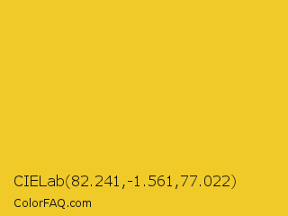 CIELab 82.241,-1.561,77.022 Color is a normal yellow color and the nearest color is Saffron #f4c430. Hex code #efca28 and RGB value is rgb(239,202,40). In RGB color space, this color is composed of 94% red, 79% green, 16% blue, In CMYK color space, this color is composed of 0% cyan, 15% magenta, 83% yellow , 6% black , In HSL color space, this color has a hue angle of 49° , 86% saturation and 55% lightness.