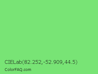 CIELab 82.252,-52.909,44.5 Color is a light green color and the nearest color is Pastel Green #77dd77. Hex code #78e475 and RGB value is rgb(120,228,117). In RGB color space, this color is composed of 47% red, 89% green, 46% blue, In CMYK color space, this color is composed of 47% cyan, 0% magenta, 49% yellow , 11% black , In HSL color space, this color has a hue angle of 118° , 67% saturation and 68% lightness.