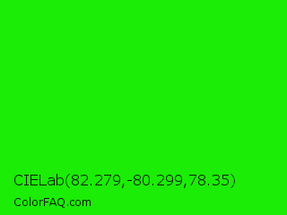 CIELab 82.279,-80.299,78.35 Color is a normal green color and the nearest color is Green #00ff00. Hex code #1bed06 and RGB value is rgb(27,237,6). In RGB color space, this color is composed of 11% red, 93% green, 2% blue, In CMYK color space, this color is composed of 89% cyan, 0% magenta, 97% yellow , 7% black , In HSL color space, this color has a hue angle of 115° , 95% saturation and 48% lightness.