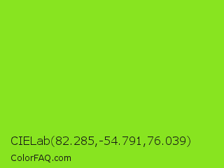 CIELab 82.285,-54.791,76.039 Color is a normal green color and the nearest color is Spring Frost #87ff2a. Hex code #88e420 and RGB value is rgb(136,228,32). In RGB color space, this color is composed of 53% red, 89% green, 13% blue, In CMYK color space, this color is composed of 40% cyan, 0% magenta, 86% yellow , 11% black , In HSL color space, this color has a hue angle of 88° , 78% saturation and 51% lightness.
