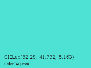 CIELab 82.28,-41.732,-5.163 Color is a normal cyan color and the nearest color is Turquoise #40e0d0. Hex code #4ee2d5 and RGB value is rgb(78,226,213). In RGB color space, this color is composed of 31% red, 89% green, 84% blue, In CMYK color space, this color is composed of 65% cyan, 0% magenta, 6% yellow , 11% black , In HSL color space, this color has a hue angle of 175° , 72% saturation and 60% lightness.