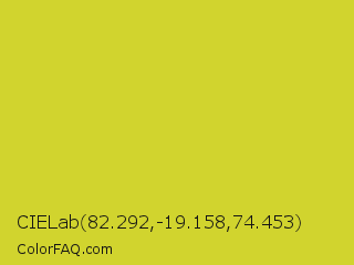 CIELab 82.292,-19.158,74.453 Color is a normal yellow color and the nearest color is Pear #d1e231. Hex code #d1d42e and RGB value is rgb(209,212,46). In RGB color space, this color is composed of 82% red, 83% green, 18% blue, In CMYK color space, this color is composed of 1% cyan, 0% magenta, 78% yellow , 17% black , In HSL color space, this color has a hue angle of 61° , 66% saturation and 51% lightness.