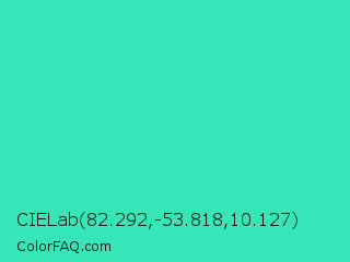 CIELab 82.292,-53.818,10.127 Color is a normal cyan color and the nearest color is Turquoise PWG #30d5c8. Hex code #36e6b8 and RGB value is rgb(54,230,184). In RGB color space, this color is composed of 21% red, 90% green, 72% blue, In CMYK color space, this color is composed of 77% cyan, 0% magenta, 20% yellow , 10% black , In HSL color space, this color has a hue angle of 164° , 78% saturation and 56% lightness.