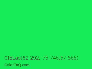 CIELab 82.292,-75.746,57.566 Color is a normal green color and the nearest color is Malachite #0bda51. Hex code #15ec57 and RGB value is rgb(21,236,87). In RGB color space, this color is composed of 8% red, 93% green, 34% blue, In CMYK color space, this color is composed of 91% cyan, 0% magenta, 63% yellow , 7% black , In HSL color space, this color has a hue angle of 138° , 85% saturation and 50% lightness.