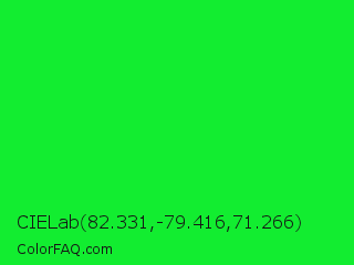 CIELab 82.331,-79.416,71.266 Color is a normal green color and the nearest color is Vivid Malachite #00cc33. Hex code #12ed30 and RGB value is rgb(18,237,48). In RGB color space, this color is composed of 7% red, 93% green, 19% blue, In CMYK color space, this color is composed of 92% cyan, 0% magenta, 80% yellow , 7% black , In HSL color space, this color has a hue angle of 128° , 86% saturation and 50% lightness.
