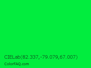 CIELab 82.337,-79.079,67.007 Color is a normal green color and the nearest color is Malachite #0bda51. Hex code #01ed3e and RGB value is rgb(1,237,62). In RGB color space, this color is composed of 0% red, 93% green, 24% blue, In CMYK color space, this color is composed of 100% cyan, 0% magenta, 74% yellow , 7% black , In HSL color space, this color has a hue angle of 136° , 99% saturation and 47% lightness.