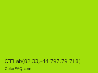 CIELab 82.33,-44.797,79.718 Color is a normal lime color and the nearest color is Vivid Lime Green #a6d608. Hex code #a1e00a and RGB value is rgb(161,224,10). In RGB color space, this color is composed of 63% red, 88% green, 4% blue, In CMYK color space, this color is composed of 28% cyan, 0% magenta, 96% yellow , 12% black , In HSL color space, this color has a hue angle of 78° , 91% saturation and 46% lightness.