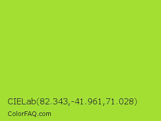 CIELab 82.343,-41.961,71.028 Color is a normal green color and the nearest color is Yellow Green #9acd32. Hex code #a4df36 and RGB value is rgb(164,223,54). In RGB color space, this color is composed of 64% red, 87% green, 21% blue, In CMYK color space, this color is composed of 26% cyan, 0% magenta, 76% yellow , 13% black , In HSL color space, this color has a hue angle of 81° , 73% saturation and 54% lightness.