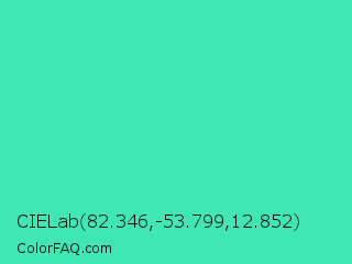 CIELab 82.346,-53.799,12.852 Color is a normal green color and the nearest color is Eucalyptus #44d7a8. Hex code #40e6b3 and RGB value is rgb(64,230,179). In RGB color space, this color is composed of 25% red, 90% green, 70% blue, In CMYK color space, this color is composed of 72% cyan, 0% magenta, 22% yellow , 10% black , In HSL color space, this color has a hue angle of 162° , 77% saturation and 58% lightness.
