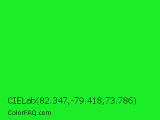 CIELab 82.347,-79.418,73.786 Color is a normal green color and the nearest color is Neon Green #39ff14. Hex code #1bed26 and RGB value is rgb(27,237,38). In RGB color space, this color is composed of 11% red, 93% green, 15% blue, In CMYK color space, this color is composed of 89% cyan, 0% magenta, 84% yellow , 7% black , In HSL color space, this color has a hue angle of 123° , 85% saturation and 52% lightness.