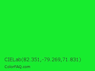 CIELab 82.351,-79.269,71.831 Color is a normal green color and the nearest color is Vivid Malachite #00cc33. Hex code #17ed2e and RGB value is rgb(23,237,46). In RGB color space, this color is composed of 9% red, 93% green, 18% blue, In CMYK color space, this color is composed of 90% cyan, 0% magenta, 81% yellow , 7% black , In HSL color space, this color has a hue angle of 126° , 86% saturation and 51% lightness.