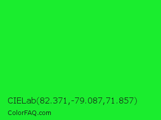 CIELab 82.371,-79.087,71.857 Color is a normal green color and the nearest color is Lime Green #32cd32. Hex code #1aed2e and RGB value is rgb(26,237,46). In RGB color space, this color is composed of 10% red, 93% green, 18% blue, In CMYK color space, this color is composed of 89% cyan, 0% magenta, 81% yellow , 7% black , In HSL color space, this color has a hue angle of 126° , 85% saturation and 52% lightness.