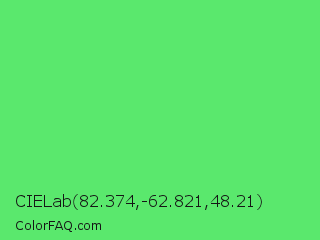 CIELab 82.374,-62.821,48.21 Color is a light green color and the nearest color is Screamin Green #66ff66. Hex code #5ae86d and RGB value is rgb(90,232,109). In RGB color space, this color is composed of 35% red, 91% green, 43% blue, In CMYK color space, this color is composed of 61% cyan, 0% magenta, 53% yellow , 9% black , In HSL color space, this color has a hue angle of 128° , 76% saturation and 63% lightness.