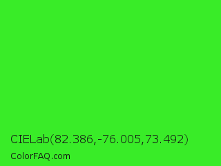CIELab 82.386,-76.005,73.492 Color is a normal green color and the nearest color is Neon Green #39ff14. Hex code #39ec28 and RGB value is rgb(57,236,40). In RGB color space, this color is composed of 22% red, 93% green, 16% blue, In CMYK color space, this color is composed of 76% cyan, 0% magenta, 83% yellow , 7% black , In HSL color space, this color has a hue angle of 115° , 84% saturation and 54% lightness.